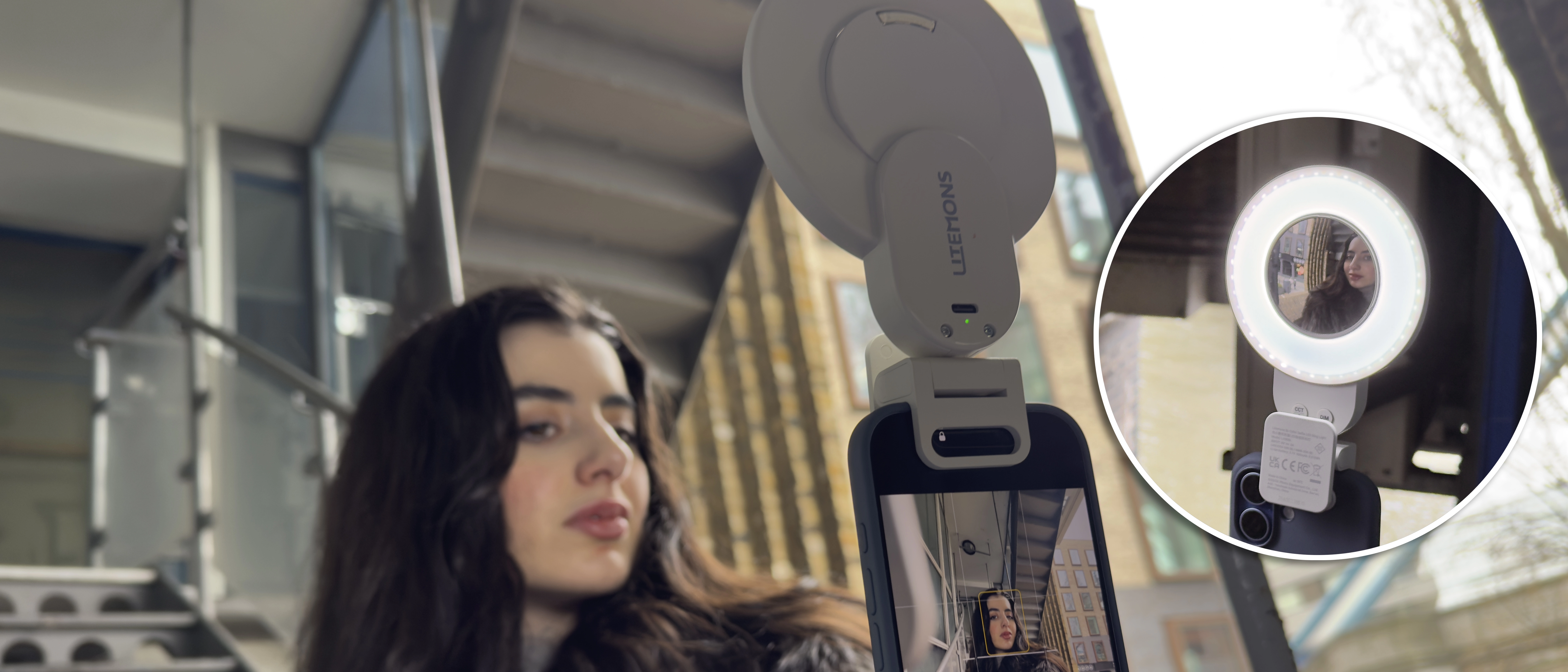 Since the LR30Bi is primarily a selfie LED, I popped it onto my iPhone 17 and gave it to Antonia to test out. She started by using the iPhone’s front-facing camera to capture some selfies and was able to compose her shots using the iPhone’s generous 6.3in display. A couple of taps on the CCT button enabled her to make the ring light’s output complement the daylight that was entering the location from her left. So the sun provided a key light, while the LR30Bi filled in the harsh shadows and added a sparkle to her eyes.