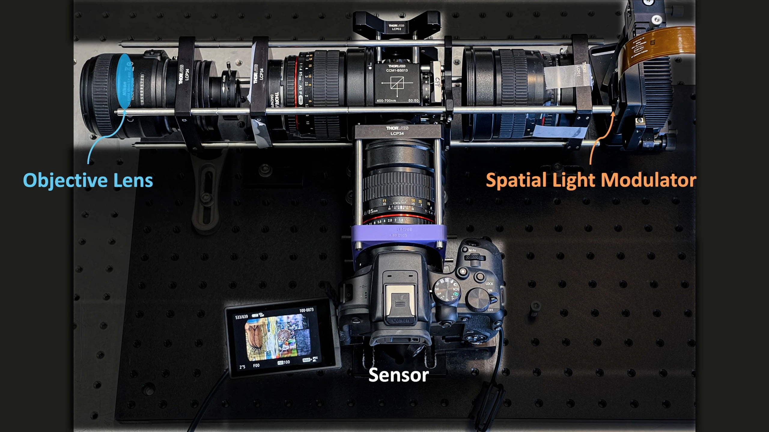 Light comes in from the top-left of the T through the variable lens, through one relay lens, through a beam splitter and cubic phase plate, through another relay lens, then to the Spatial Light Modulator, bouncing back where that beam splitter then redirects the light into another relay lens and, finally, to the camera, which is a Canon EOS R10.