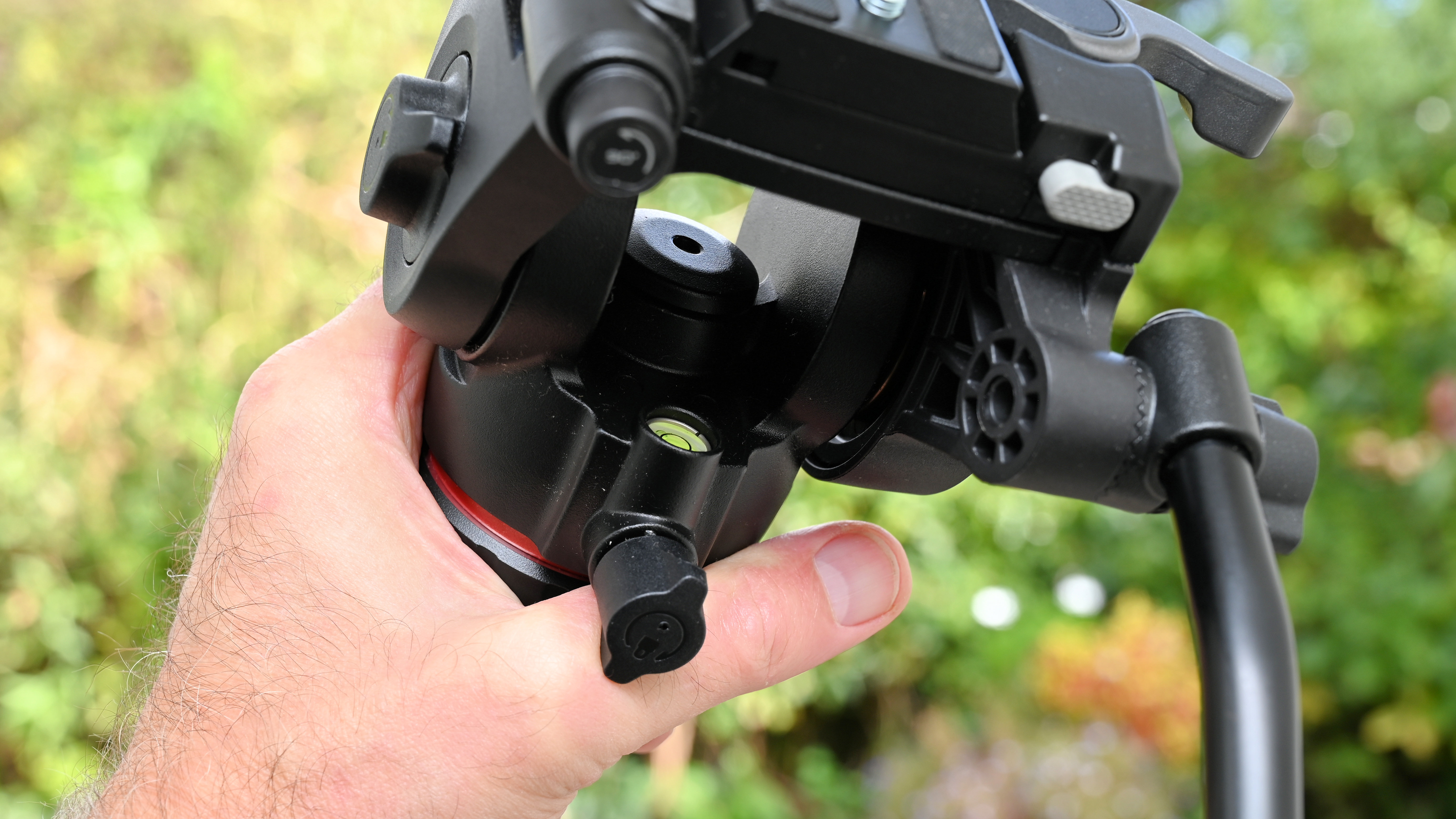 Around the back is the lock/release knob for panning, which is equally necessary for both stills and video. Just above this knob is a bubble level built into the head, which you can use in conjunction with the one in the legs.