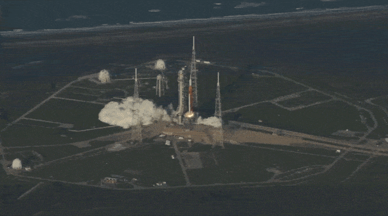 With the unengaging name 'Cam 11 View' in this compilation of every shot of the launch of the SLS (19:32), the camera tracks the rocket from the pad all the way through Max-Q, Solid Rocket Booster (SRB) separation, and beyond – all shot from a camera on board a plane with no more than 14 seats.