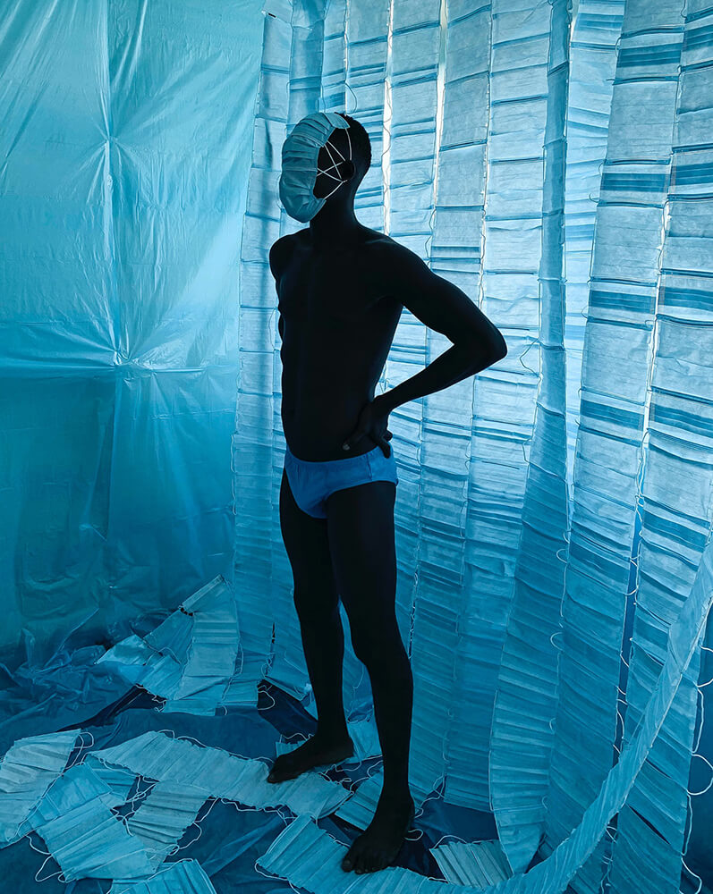 From the subject to the background, blue face masks dominate this prize-winning image photograph