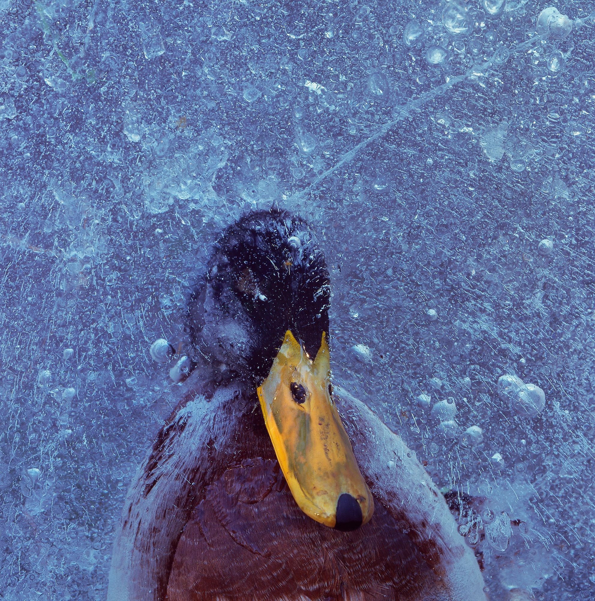 The photo is almost poetic, with the mallard drake caught partly above and partly beneath the ice – a stark visual divide between life and death, shot on 120 film