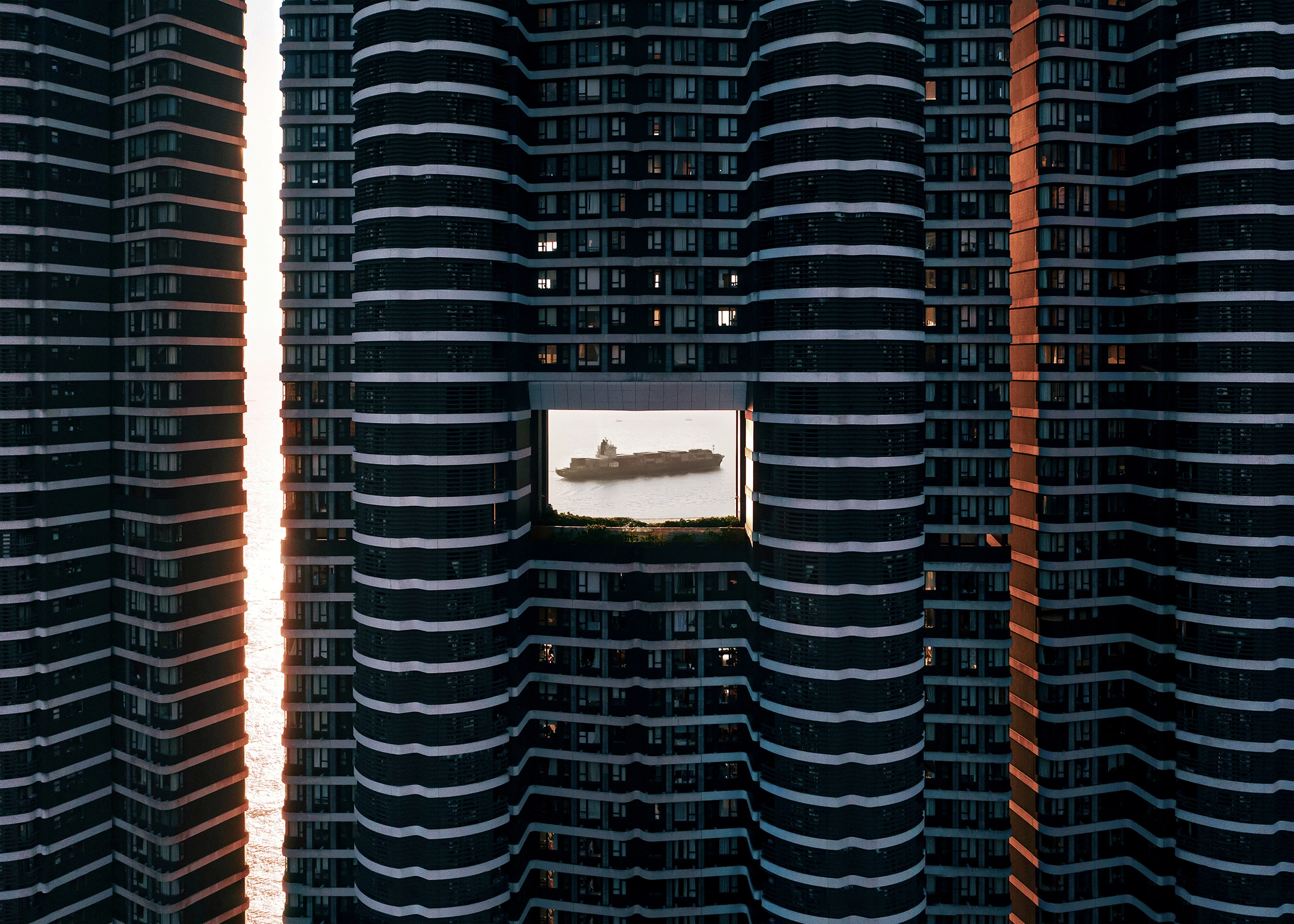 Ainsworth says about the image, "A lone container ship passes by the front of a residential building in Hong Kong. The ship can be seen through the building's 'dragon gate'-a feng shui design feature said to allow dragons to pass through from the mountains to the sea.