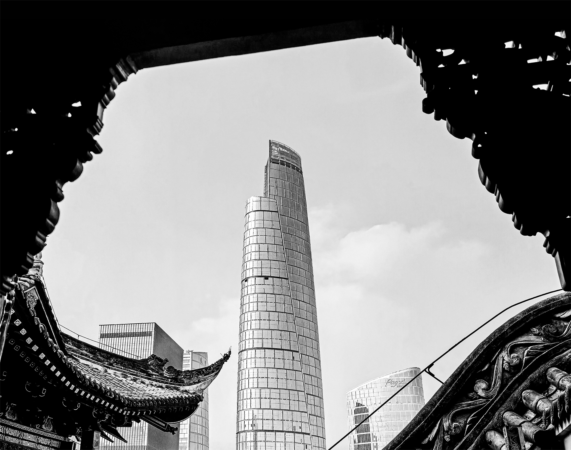 Old eaves cradle a rising tower in Chongqing – past and present aligned in silent symmetry.