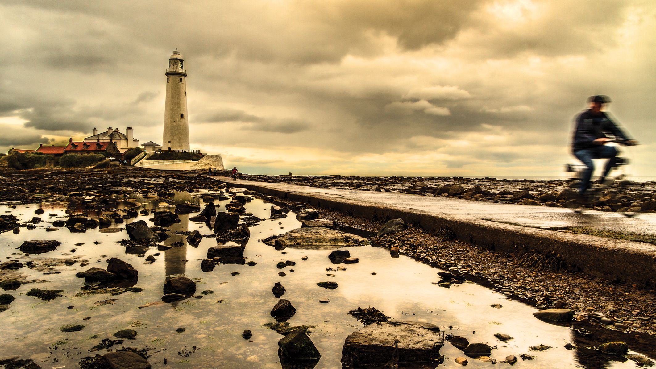 The motion of the biker away from the lighthouse opposes the direction of the path
