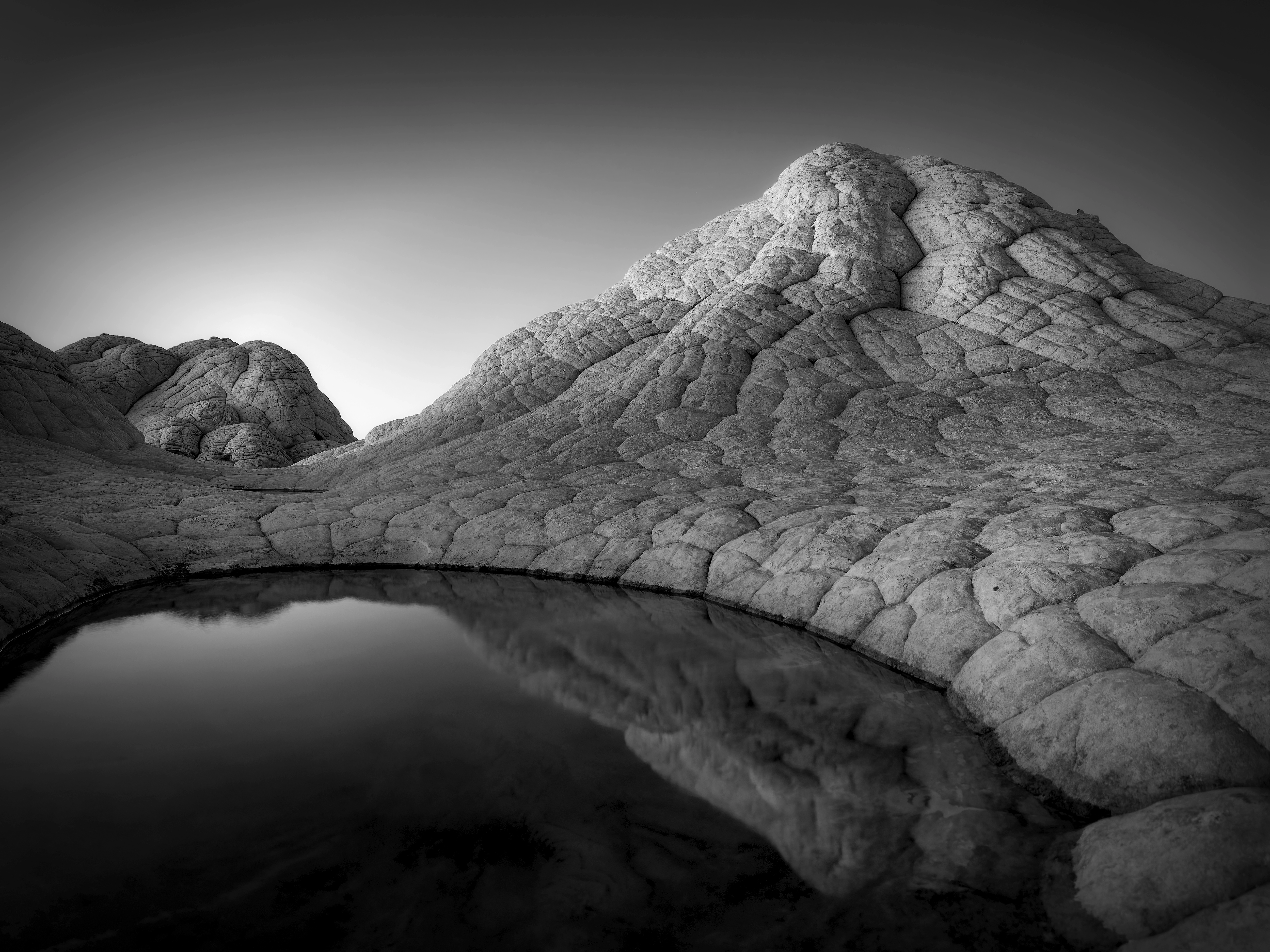 The first thing that strikes you is the otherworldly simplicity of the scene. Brain-like sandstone formations rise from a mirror-still pool, their weathered surfaces rendered in shades of grey that emphasize every curve and crevice.