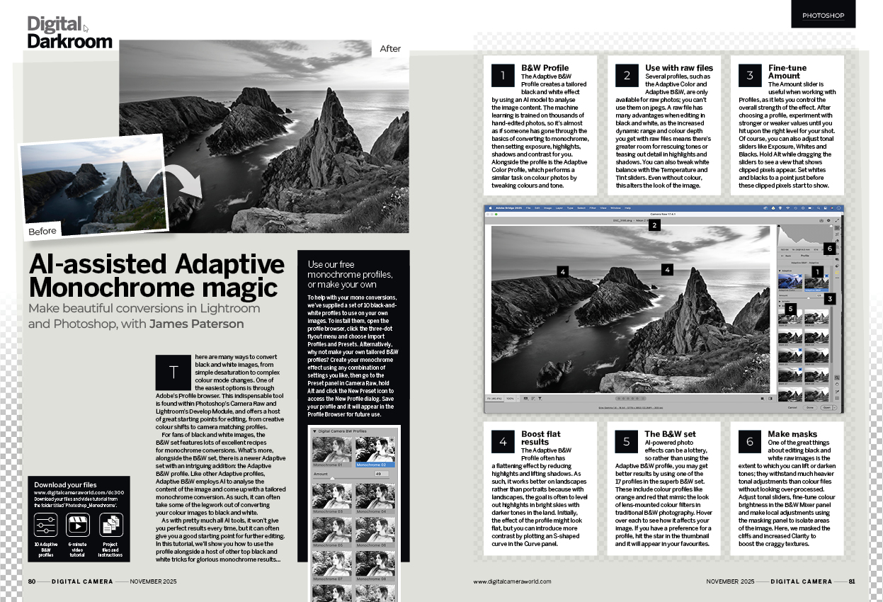 Discover AI-assisted editing techniques for creating beautiful mono conversions (pictured, above), and learn how to use Lightroom’s Lens Blur feature to defocus the background in a portrait photo.