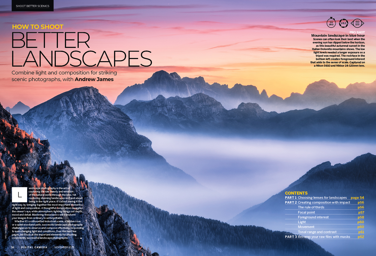 November's cover feature is a masterclass in how to combine composition and lighting to capture your best-ever landscape photos. Pro photographer Andrew James is your expert guide.