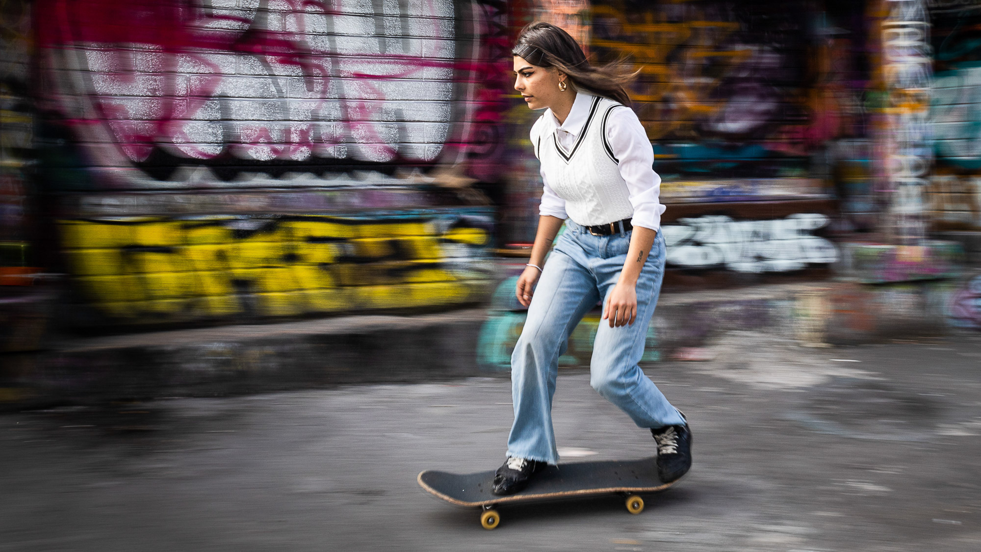 Try panning with the motion of a subject moving through the frame. Use a panning tripod head and move the camera to keep the subject in the centre. You’ll need a relatively slow shutter speed and – with luck – the subject will come out sharp while the backdrop is blurry. Here a shutter speed of 1/30 sec works for us.