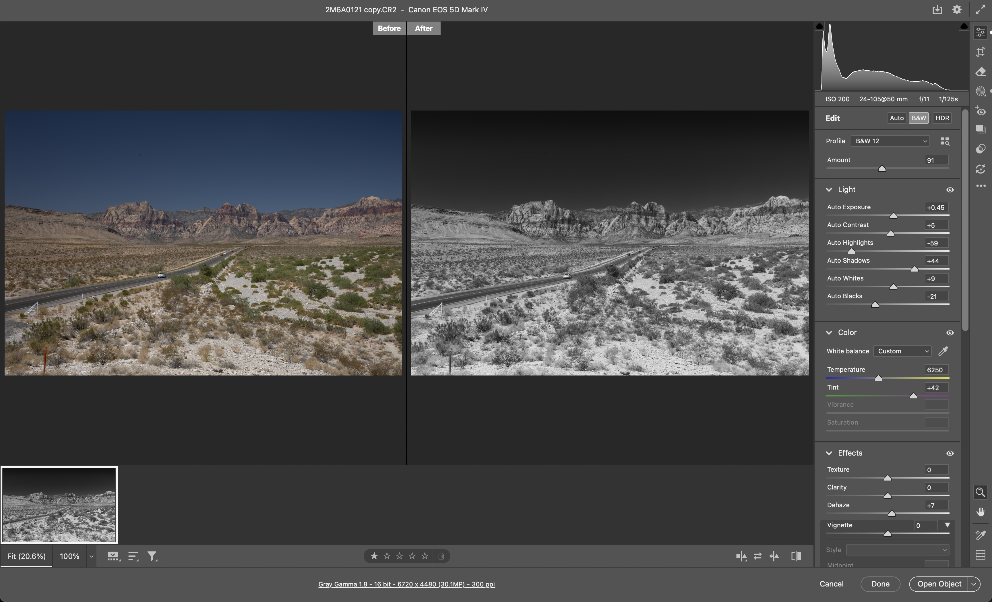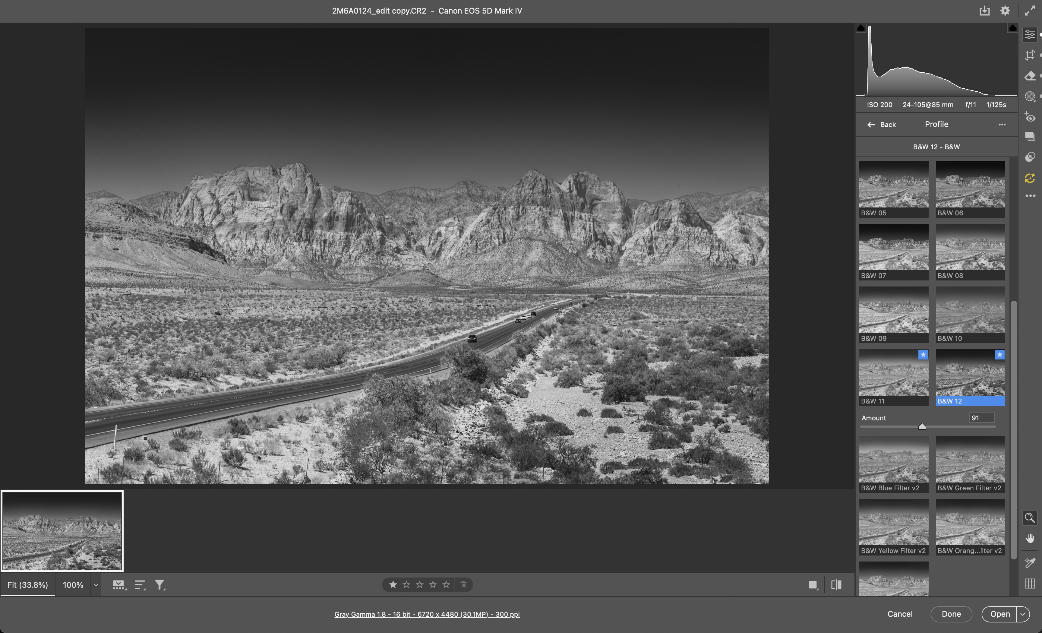 I’d used a polarizing filter for these shots of Red Rock Canyon near Las Vegas, so the skies became this incredible deep blue. While I’m happy with vibrant results, and the Red Rock mountains have a richer quality in shot, these sorts of color landscapes are also perfect for a black-and-white conversion.