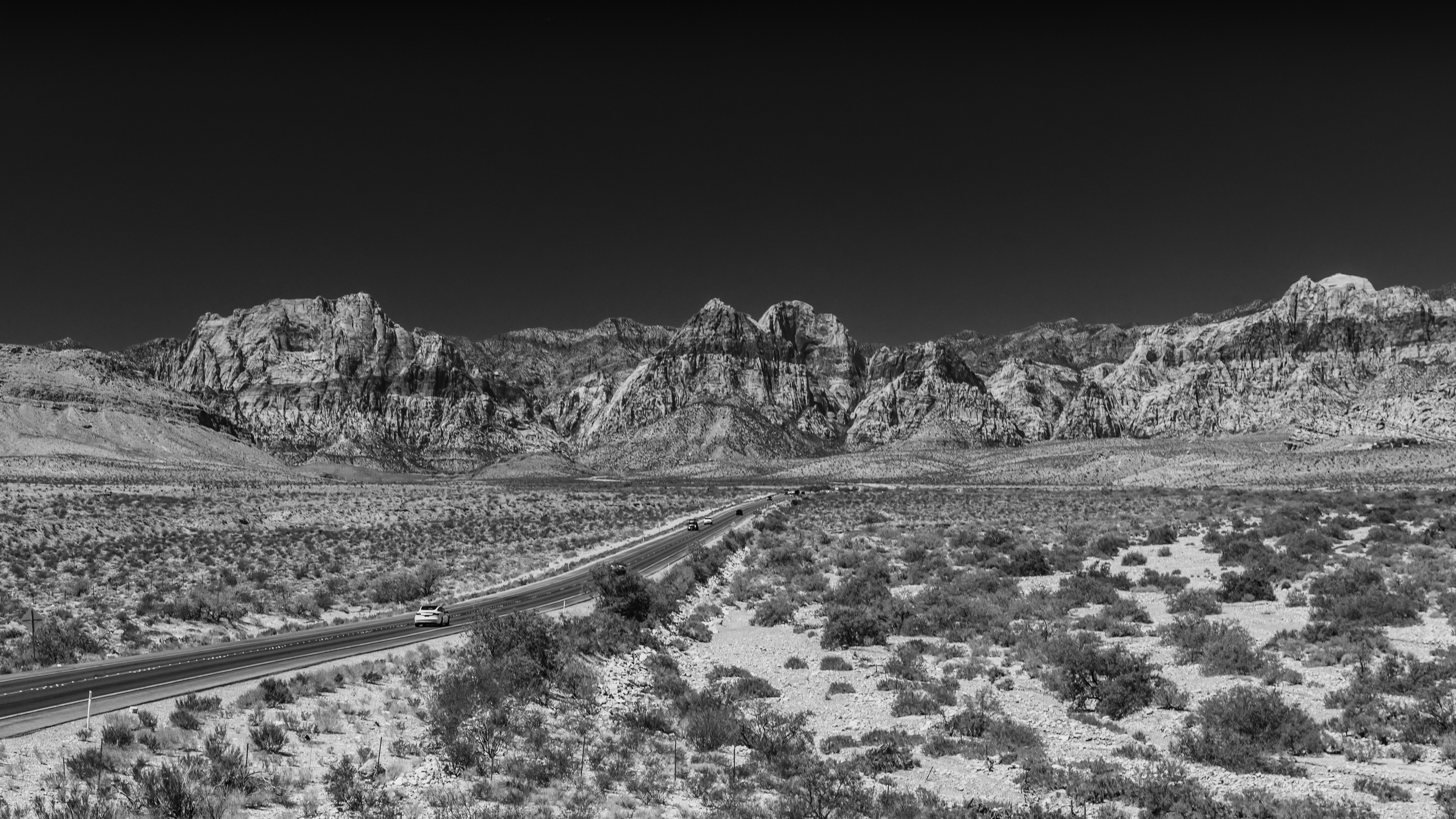 Skies become dark black and imposing, and the contrasting mountain textures jump out of the image. Now, with all color removed, the eye is drawn to the most interesting parts, and the shapes and sharp areas of a scene. For instance, in this Red Rock Canyon shot, the eye isn't distracted by the green shrubbery in the desert or the flashes of color from the cars on the road.
