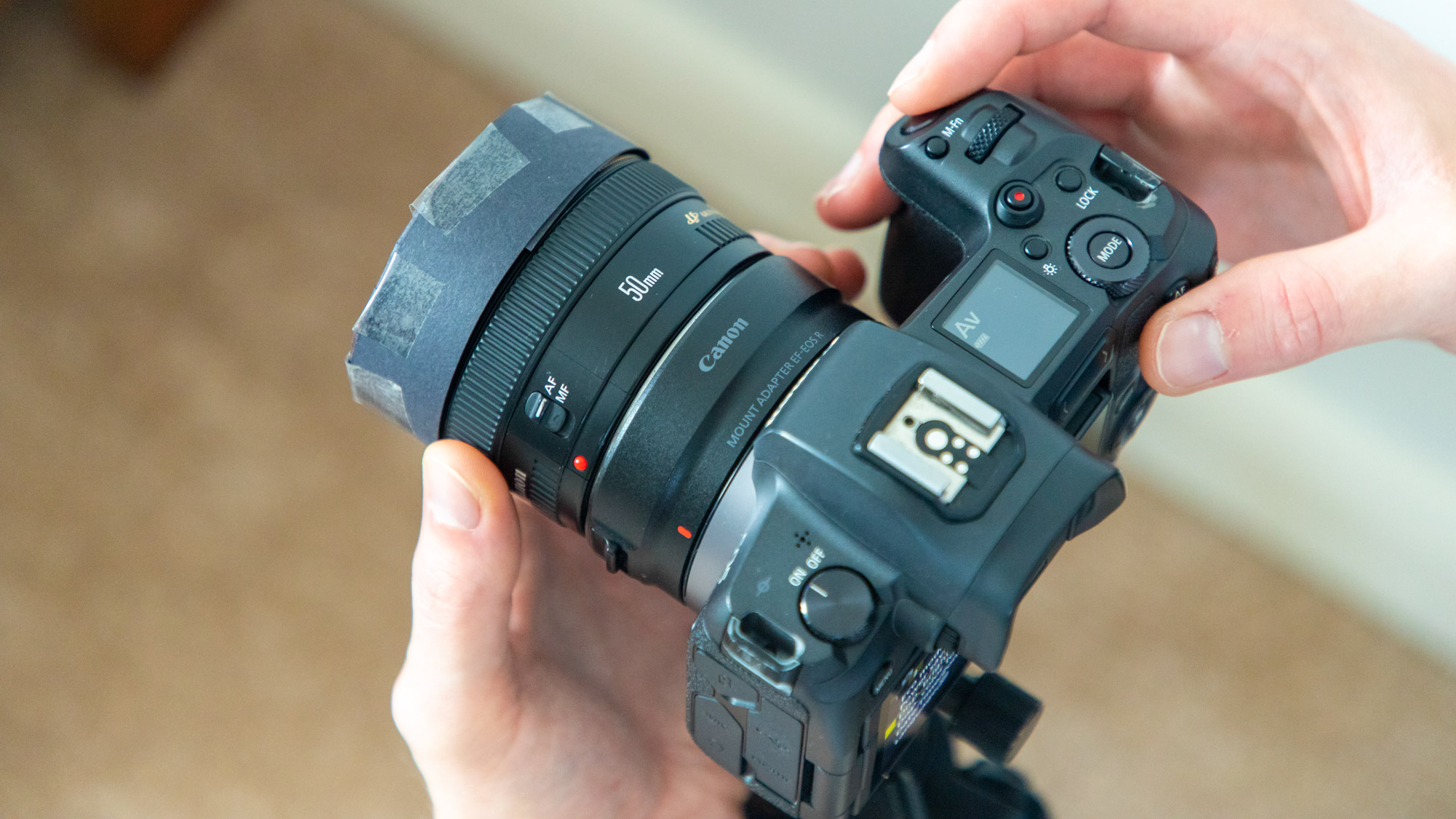 Cut a strip of card about 2cm wide and wrap this around the tabs you made on your template, then stick it in place on your lens with some tape. The whole template should then snugly fit over the front of your 50mm lens.
