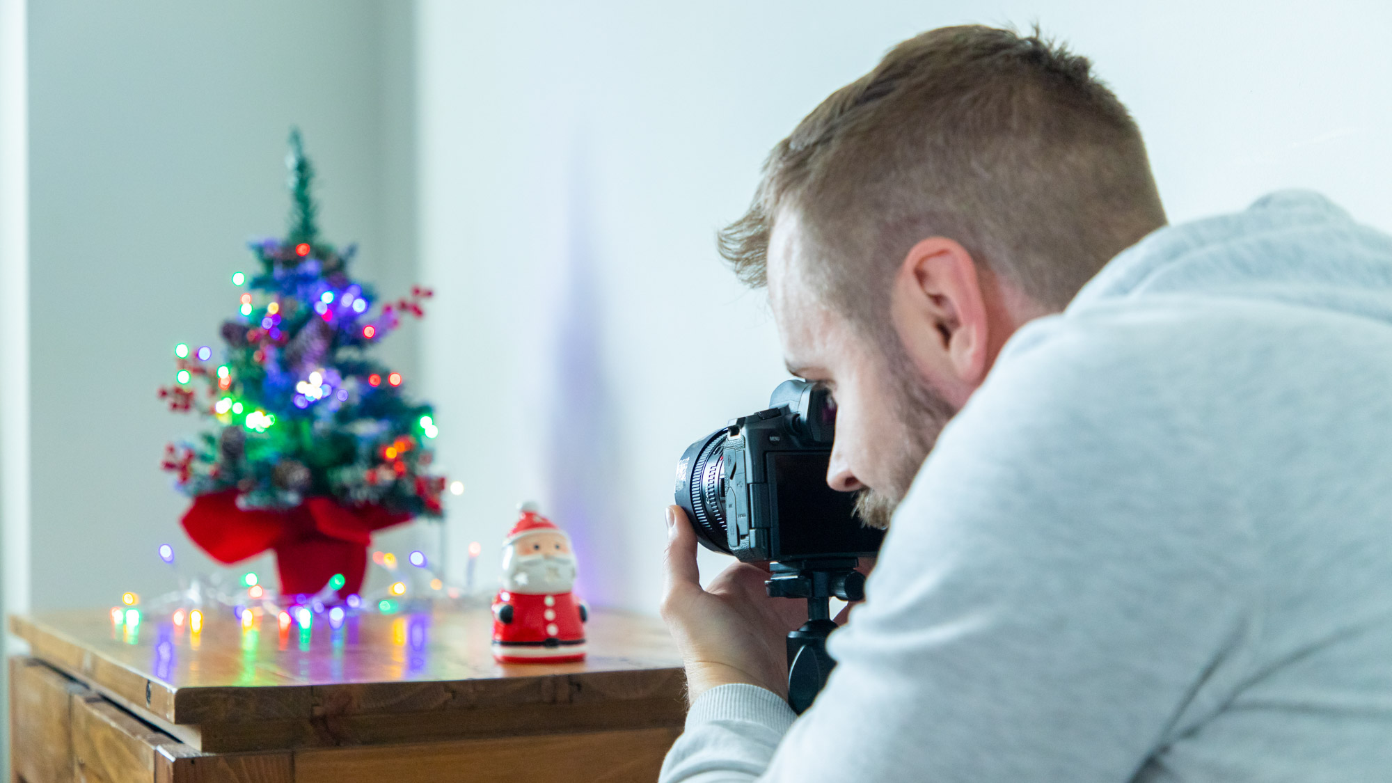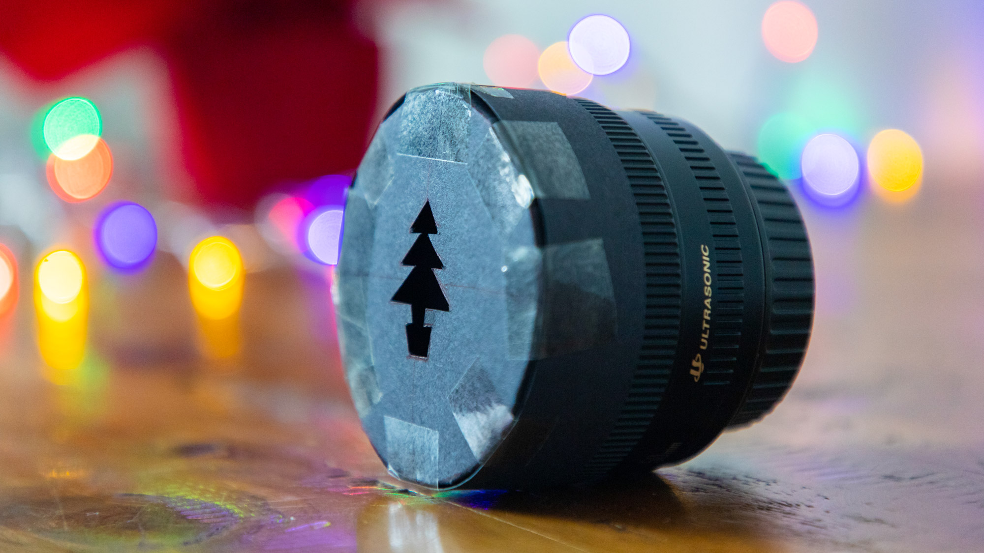 I focused super-close to my Santa Claus decoration for this image, and also set up some colourful string lights in the background to make sure there was no shortage of specular highlights that would be turned into my custom bokeh shapes using this cheap lens hack.