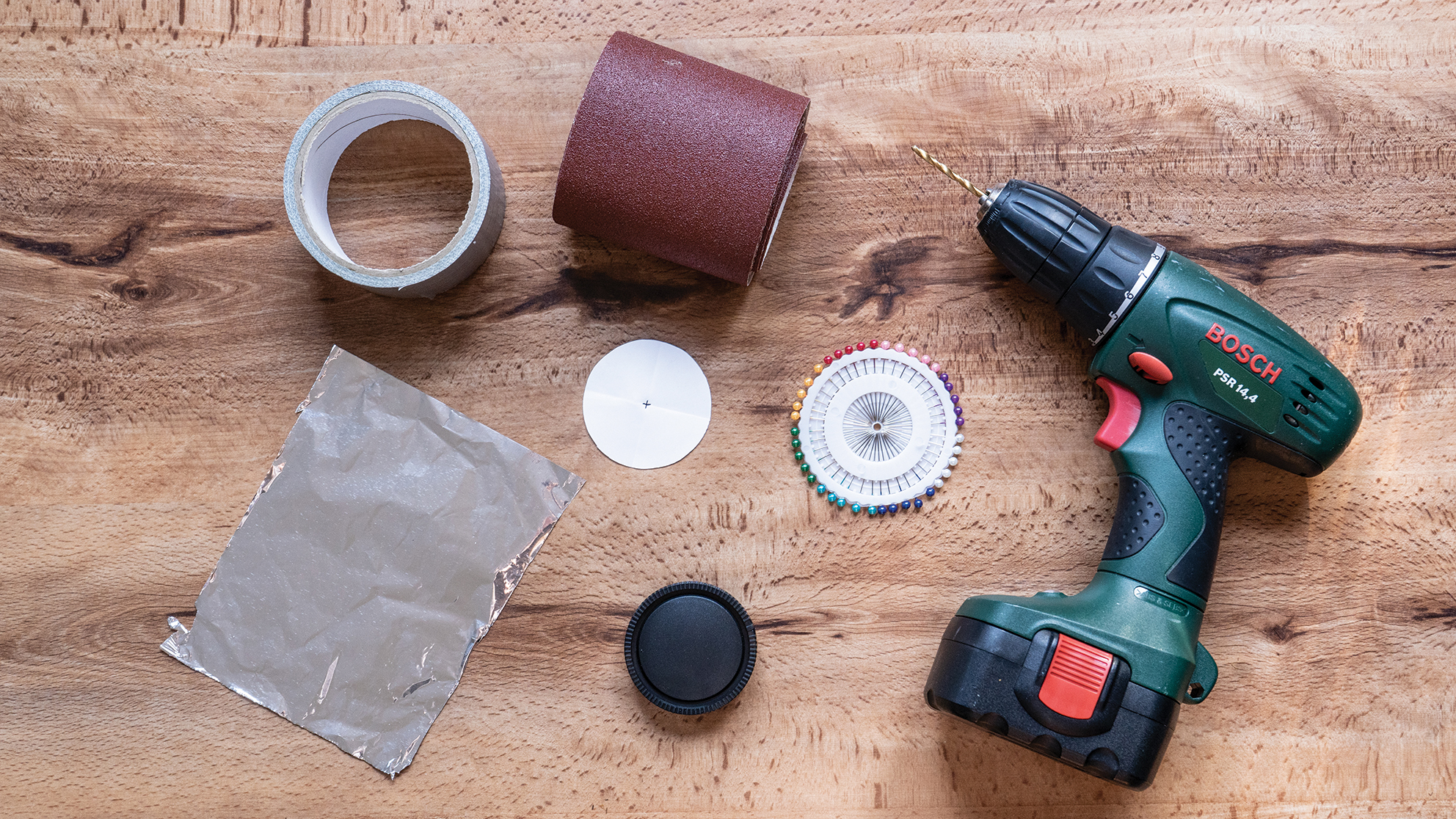 You will need a spare body cap (preferably a non-branded one to save money), an electric drill, sandpaper, aluminium foil, a needle and a piece of sticky tape. To drill the hole, create a template of your body cap out of card and mark the center point.