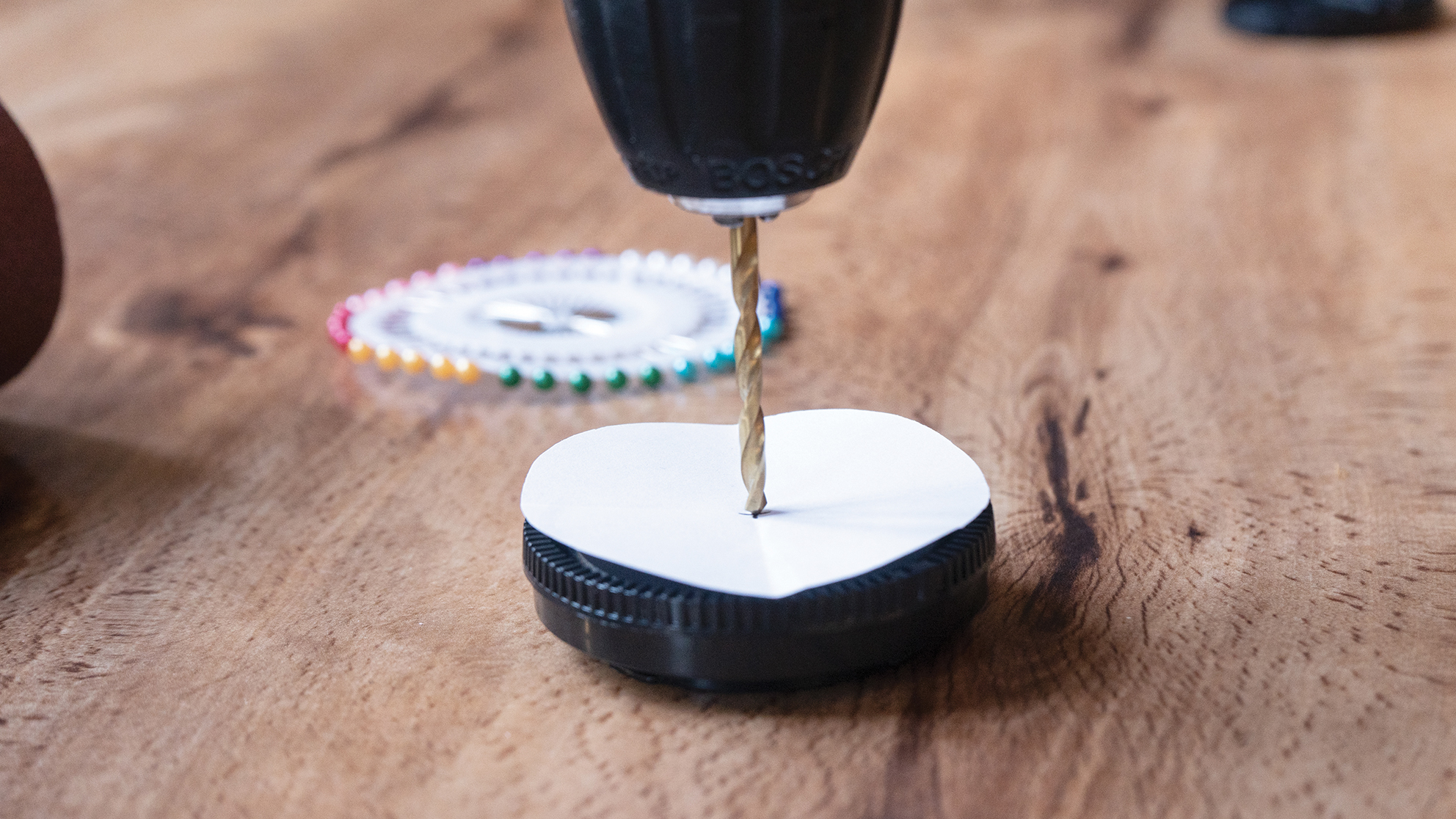 Place the template with the centre marked on it over the actual body cap and use an electric drill to create the hole. For best results, the diameter should be 3-4mm. To optimize the result, use sandpaper to remove plastic residue.