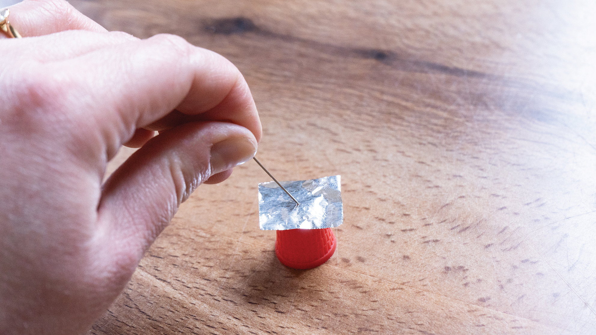 Cut off a small piece of aluminum foil and carefully prick a hole in it with the needle – the smaller the hole, the sharper the image will be. Use a piece of black tape to attach the foil to the cap in the centre of the pre-drilled hole.