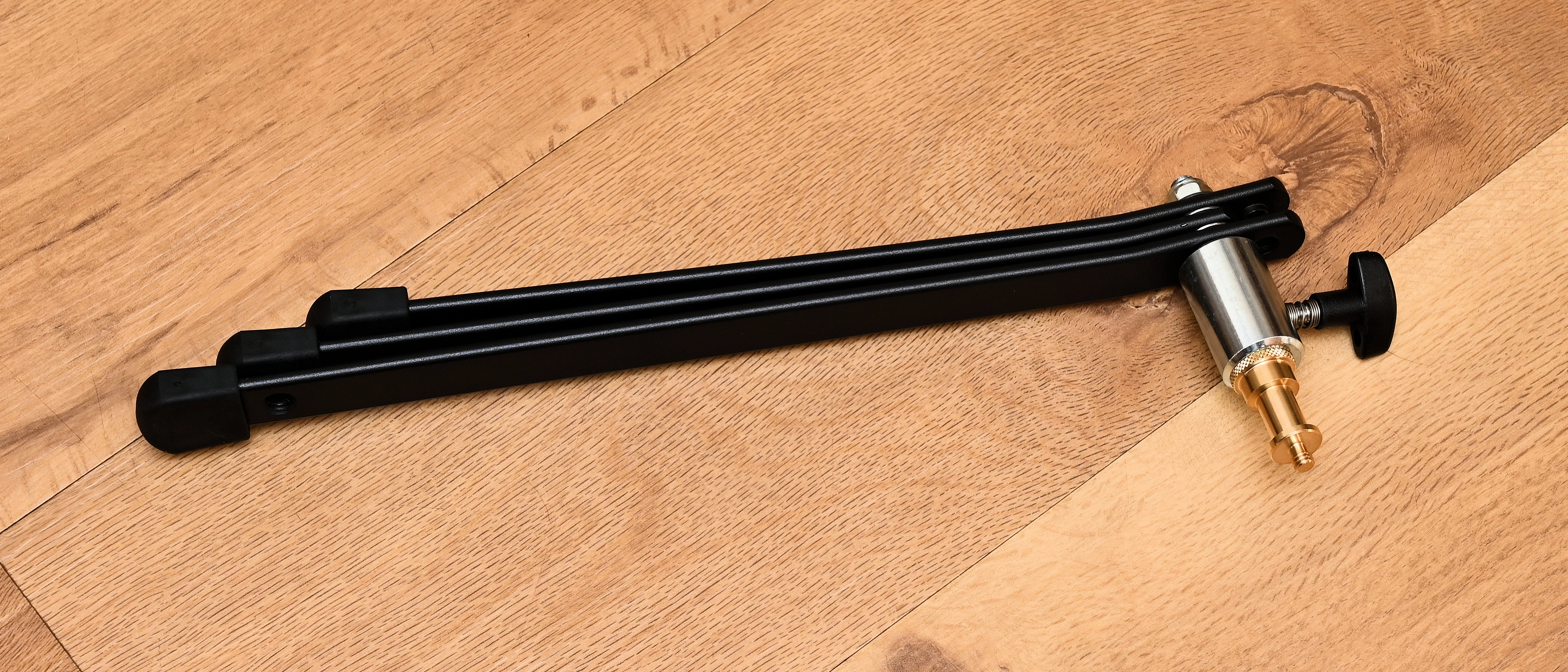 With each leg protruding about 30cm / 1’ from the central point, the stand is easy to fit into tight spaces. And although the footprint is quite small, the fact that there’s no rising column means that the center of gravity is really low. There’s therefore virtually no risk of the stand toppling over, even with relatively heavy lamps being mounted on it.