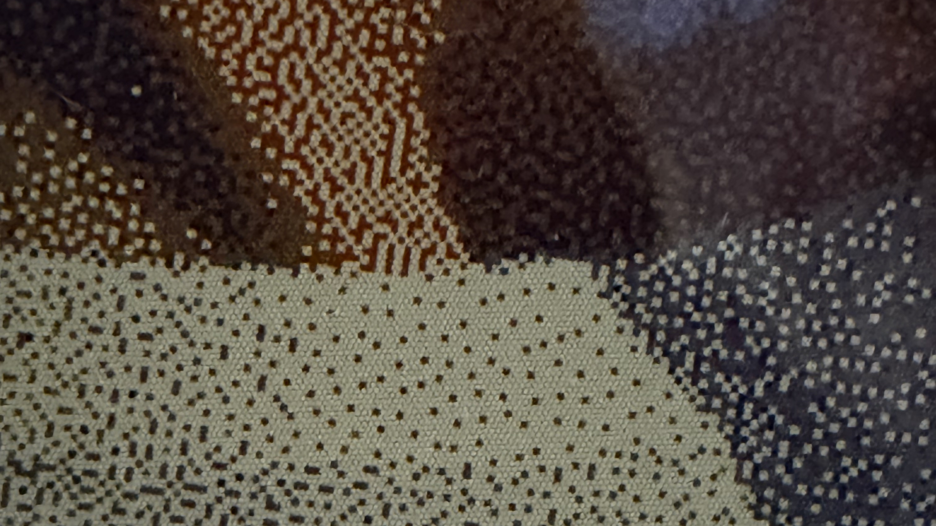 While it may have the same 1600 x 1200 resolution as many other Aura frames, it uses a completely different 'e-ink' technology to display images. Whereas a traditional LCD screen is formed from a brightly lit arrangement of pixels that can display millions of colors, the e-ink pixels themselves do not emit light but reflect the ambient room lighting, and can display just six colors: white, black, red, yellow, green, and blue. A dithering algorithm is used to create the appearance of photos with millions of colors, each pixel color chosen relative to its neighbors to create the illusion of a full-color photo, at least when viewed from a distance.