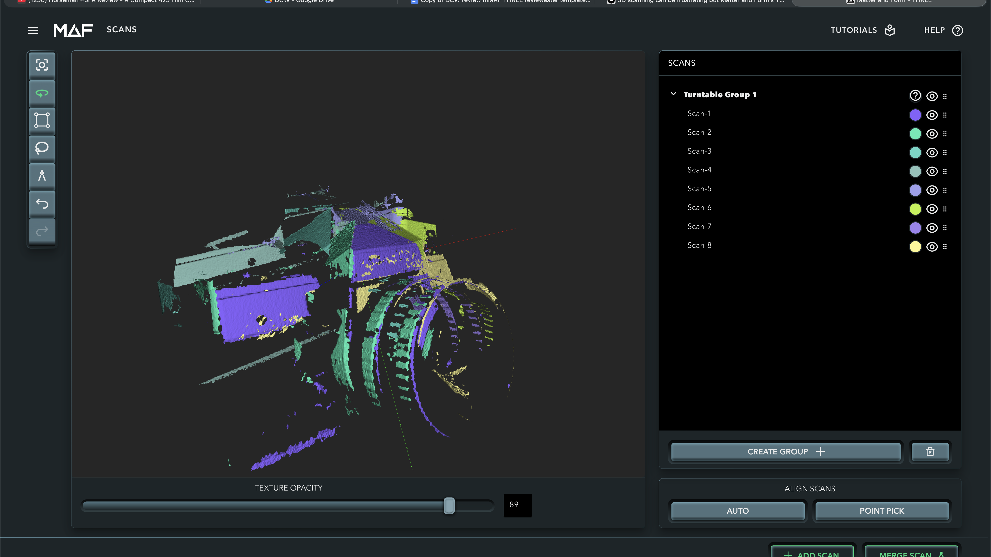 What’s more impressive is that these details are stitched seamlessly when doing multi-part scans. Now, this brings me to a slightly frustrating element, although it can be managed. The scans can be quite dense, which is necessary for good results, but it does mean files get quite large, slowing down processing. In these situations, I found that the turntable rotation gave a lot of overlap, and more data was captured than is really needed. In these cases, I was able to delete some scans while preserving the coverage of the object and freeing up space. This gets easier as you scan more and learn the best settings. It’s not a deal-breaker by any means and is completely manageable, but waiting for processing can be annoying at first.
