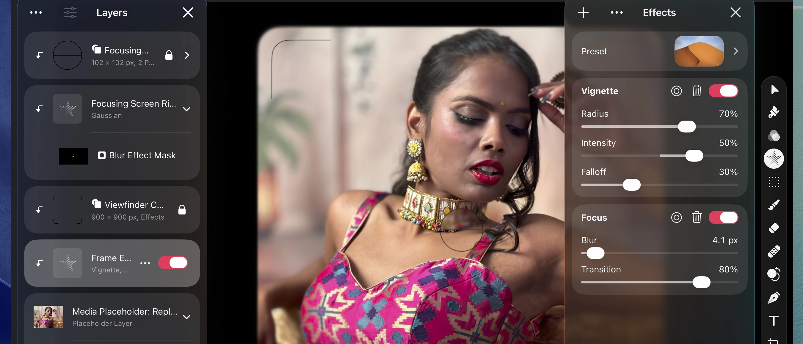 The Tilt Shift effect is particularly easy to fine-tune thanks to the iPad's touchscreen properties. The positioning of the selective blur effect is set by two control points: one to control the width of the graduated blurred edges and the other to adjust the angle of the blurred edges. Another effect – Bokeh – mimics the blurred circular artifacts produced by a camera’s wide-aperture settings, adding extra texture and character to a portrait.