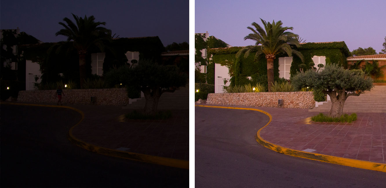 Here’s an example of using ISO effectively when shooting a scene in the evening where we want a narrow aperture of f/8 and a shutter speed of 1/80 sec for a sharp result. With our ISO set to 200 in the ambient light, the exposure is very dark (left). If we push the ISO to 1600, however, the near-nighttime shot is well exposed (right).