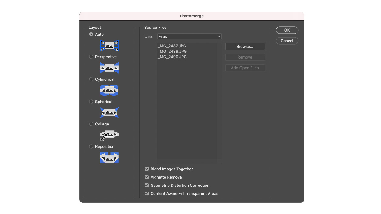 This loads the images into Photoshop CC and presents you with the Photomerge dialogue box (above), where you have control over how your images are stitched together.