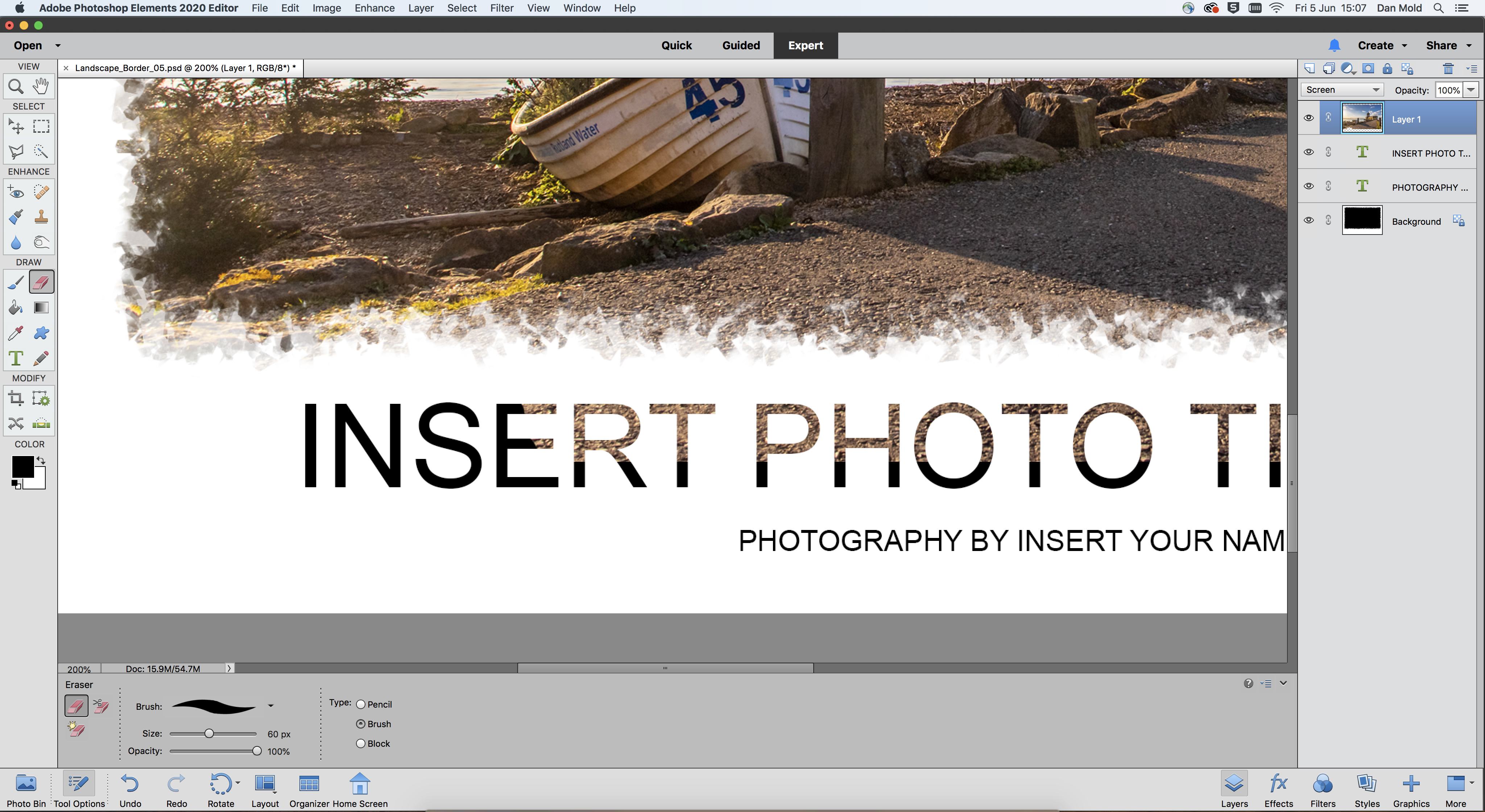 In the Layers panel double-click on the ‘T’, which is the thumbnail of the ‘Insert Title Here’ layer. You’ll then be able to type in the title of your image, then do the same for your photo credit on the layer below.