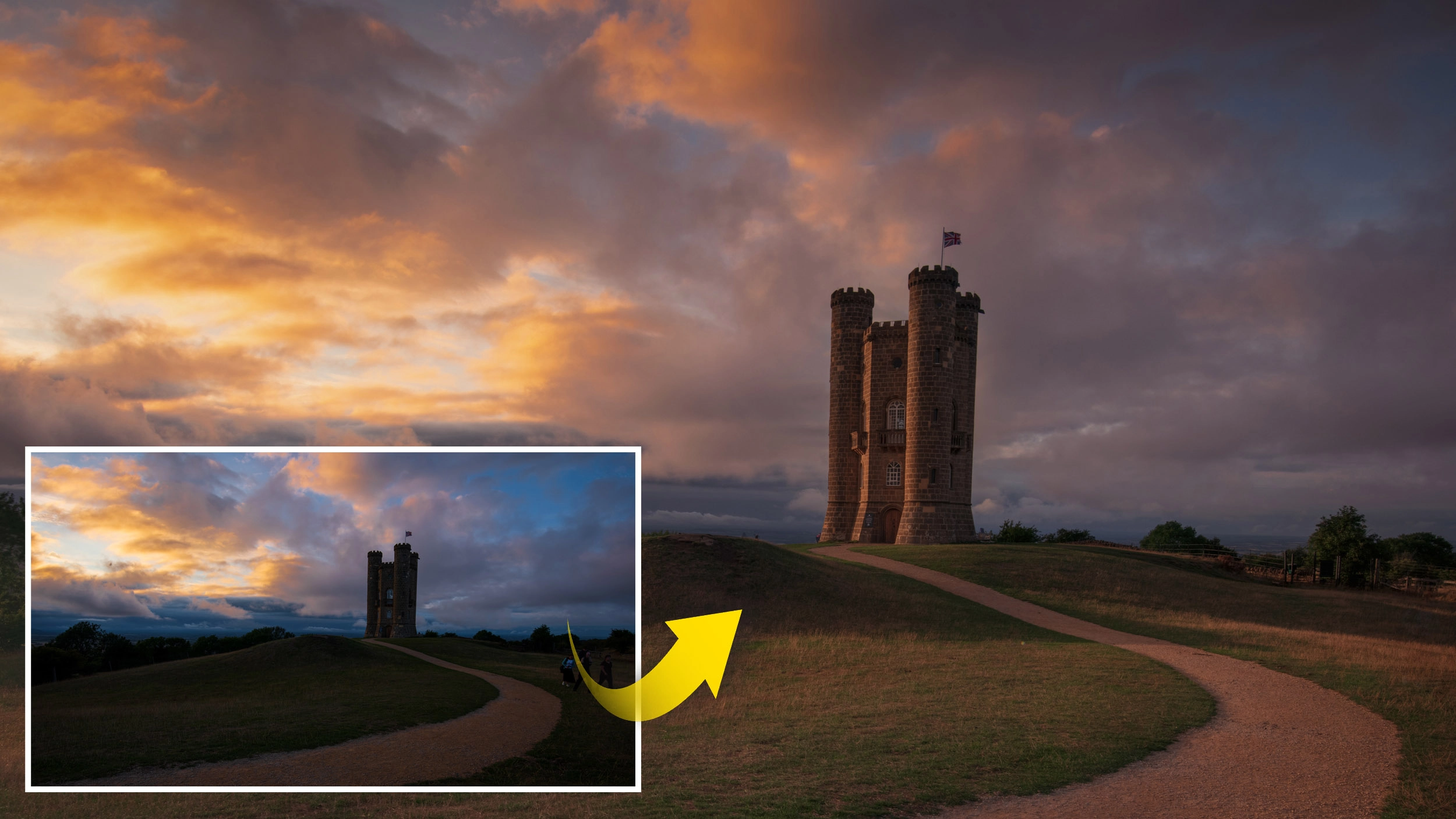 By shooting a scene several times over the course of an afternoon – from golden hour to sundown to twilight – then combining the best parts from each frame, you can effectively pick and choose the optimum lighting conditions for each part of the scene. Here the tower looks beautiful and golden when the sun is low, but the sky behind is more atmospheric a little while later, when the sun drops even further and oranges and reds begin to tint the clouds.